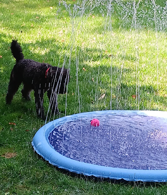 This week we have a heat wave. But fortunately, the mornings are tolerable in the shade and Lucky is enjoying his sprinkler pool most mornings. He wasn't sure of it at first but now he loves the pool. All our activities begin at daybreak (long walk) and then breakfast, visiting mom (we put the pool at her house) and she sits outside in the shade laughing at the dog. Home before noon and time to hibernate.